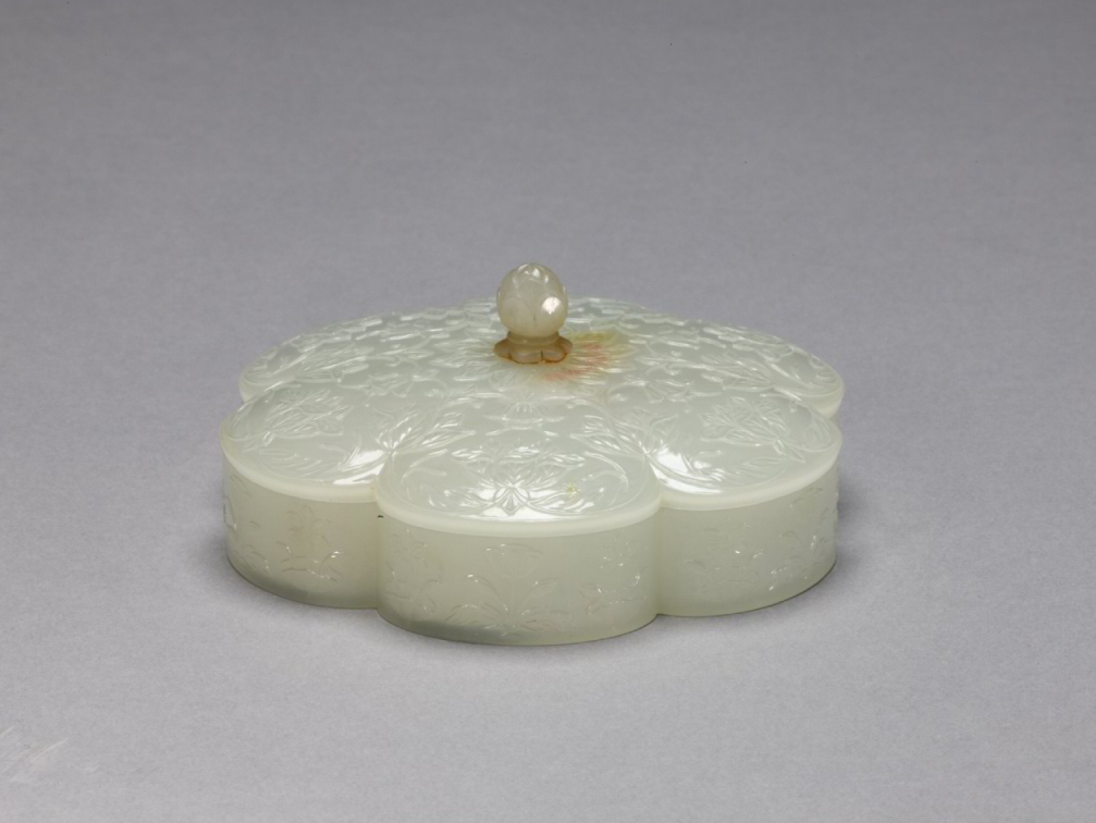 根据乾隆四十八年(1783)档案记载,皇帝大宴桌围以黄缎绣金龙镶宝石桌刷。桌上自外向内依次摆放:头路有松棚果罩4座、花瓶2个、青白玉盘5个;二路、三路有青白玉碗各9个;四路有雕漆果盒2个、小青白玉碗4个;五至八路有青白玉碗各10个;最内侧有青白玉果盅8个、盘6个、碟4个,箸、匙、叉1份。