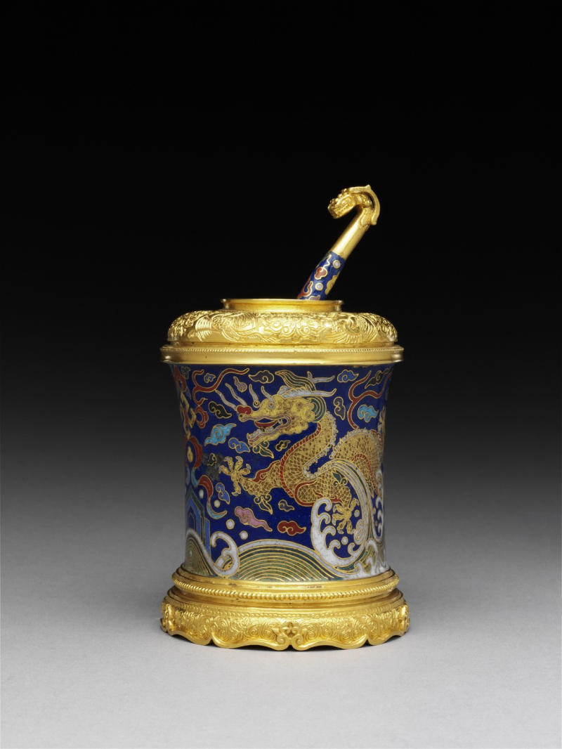 三清茶以雪水烹茶,加入松子、梅花、佛手。乾隆帝命人专门制作了三清茶碗,材质有瓷、漆、玉等。碗、盖外题御制《三清茶》诗,有“梅花色不妖,佛手香且洁。松实味芳腴,三品殊清绝。烹以折脚铛(音撑),沃之承筐雪”等句。